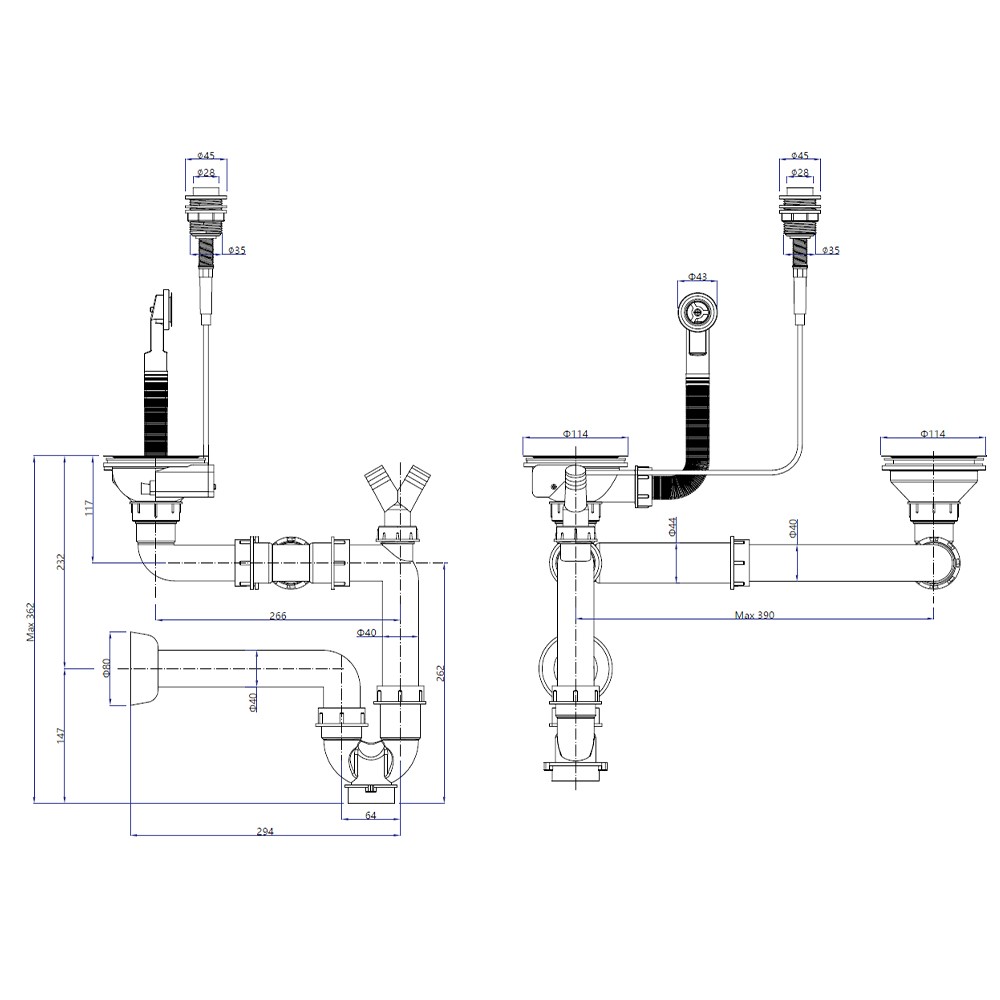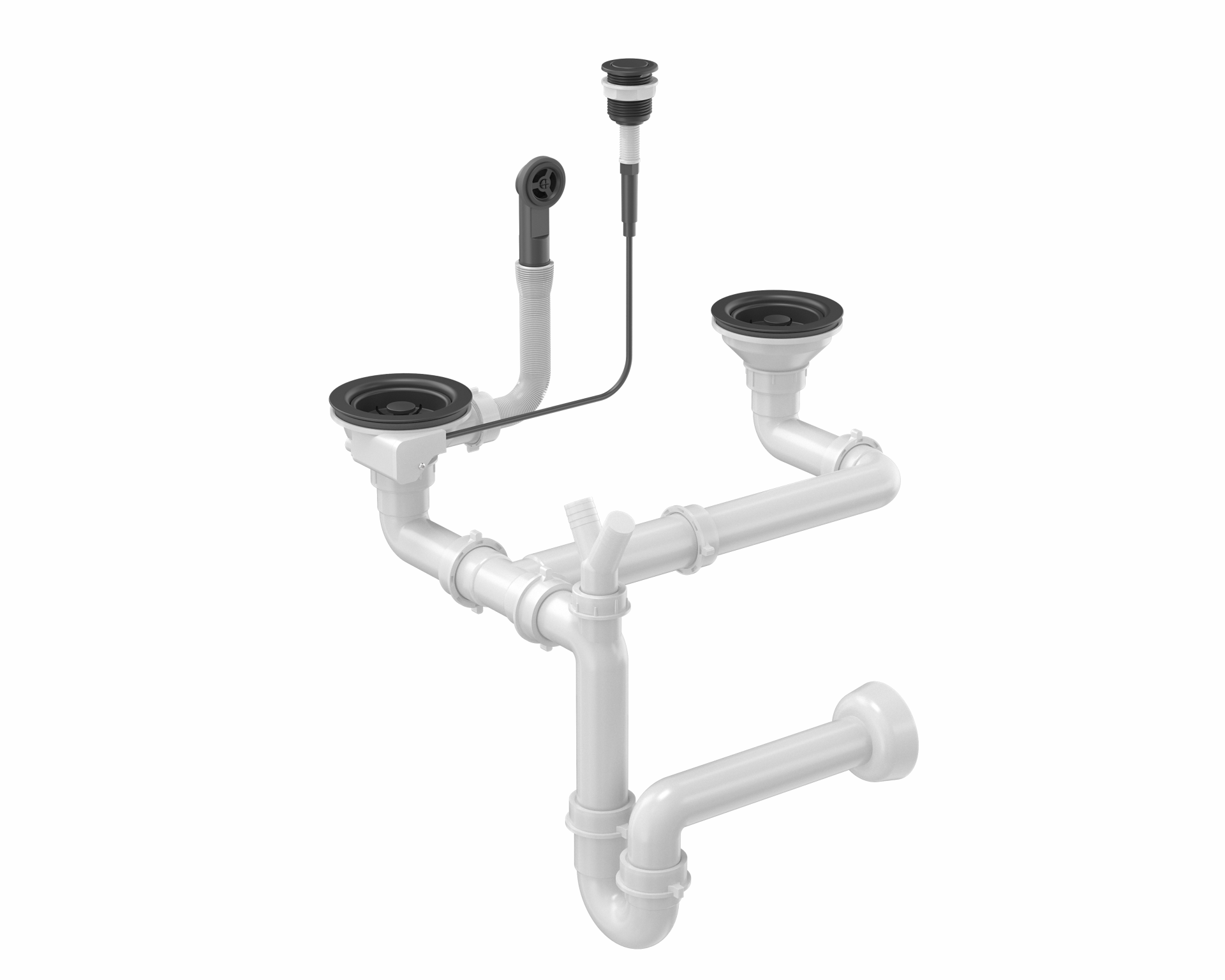 Typ: syfon przyścienny - nie wymaga tyle miejsca pod zlewem co tradycyjne syfony starego typu. Dzięki temu możliwe jest lepsze wykorzystanie przestrzeni w szafce pod zlewem.