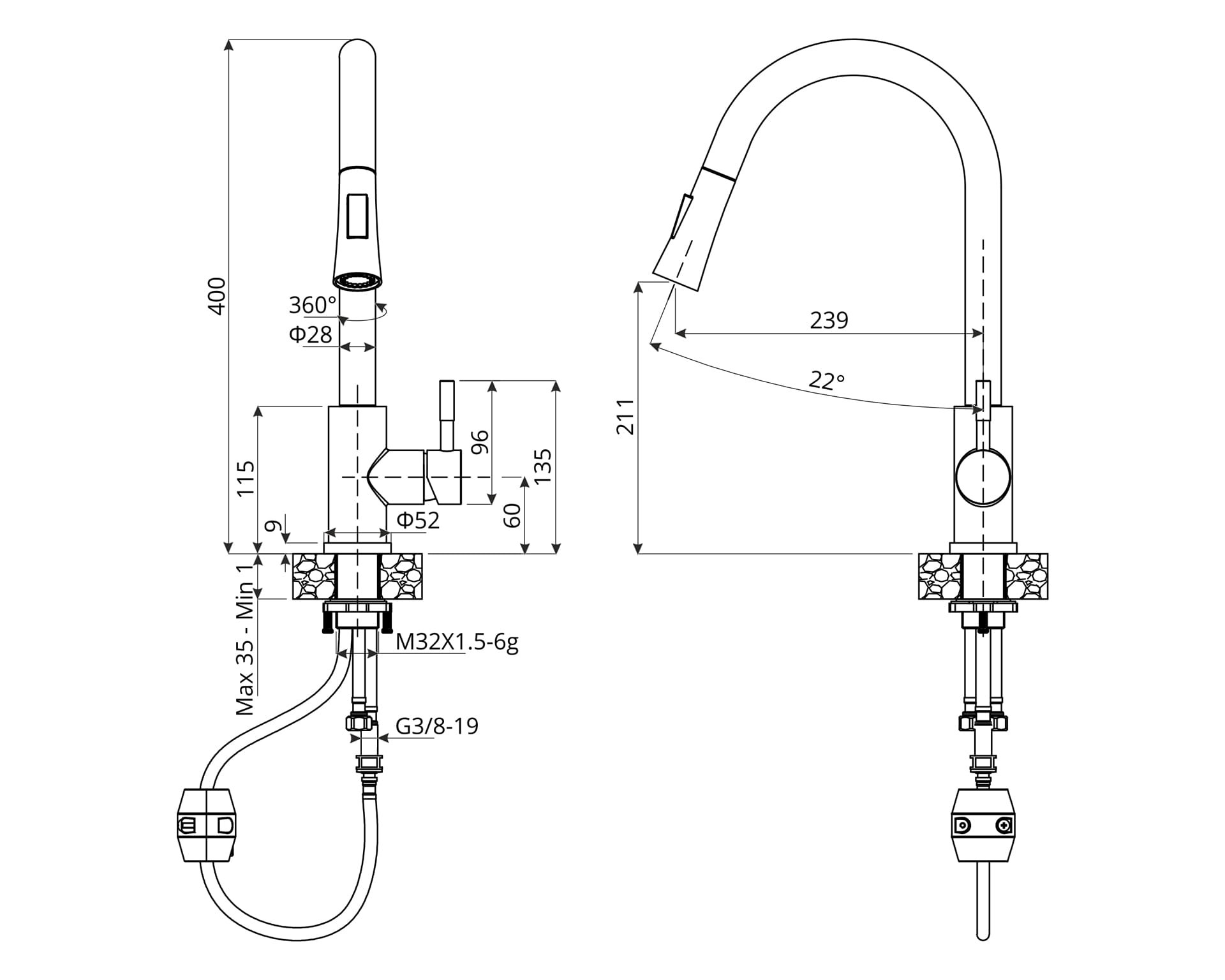 Ujście wody znajduje się na wysokości 21 cm, co sprawia, że wkładanie i wyciąganie naczyń ze zlewu jest bezproblemowe. Dodatkowo, wylewka jest obracana i ma daleki zasięg co sprawia, że sprawdza się zarówno podczas montażu centralnie za komorą zlewu jak i w jej rogu.