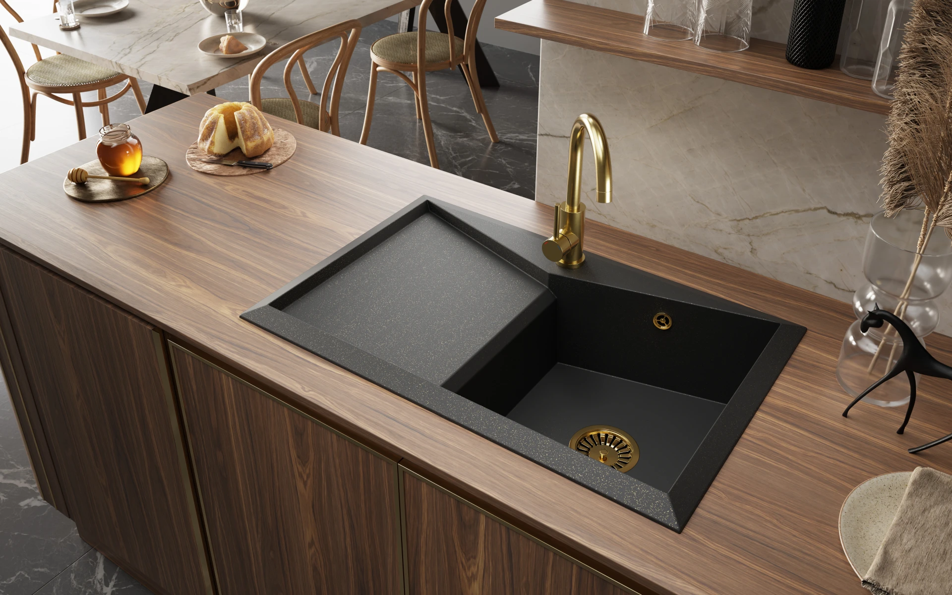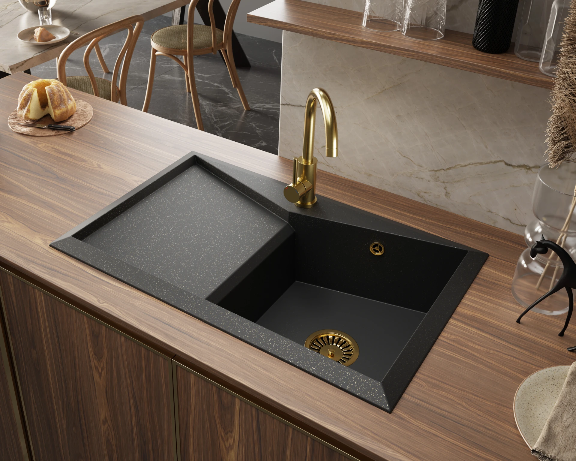 Zestaw zawiera zlewozmywak Diamond 1.0, baterię Noemi złotą i syfon złoty klasyczny