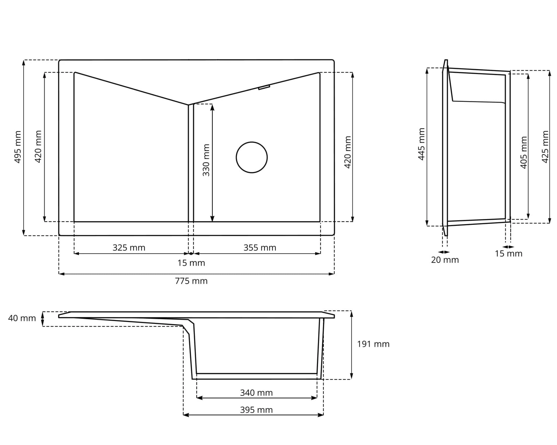 Długość i szerokość otworu na zlewozmywak w blacie powinny być mniejsze od wymiarów zlewu o 2 cm.
