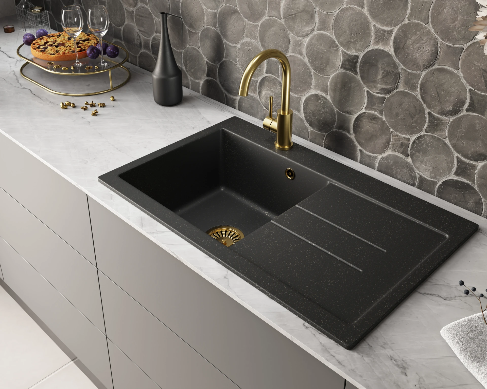 Zestaw zawiera zlewozmywak Luxor 1.0, baterię Noemi złotą i syfon złoty klasyczny