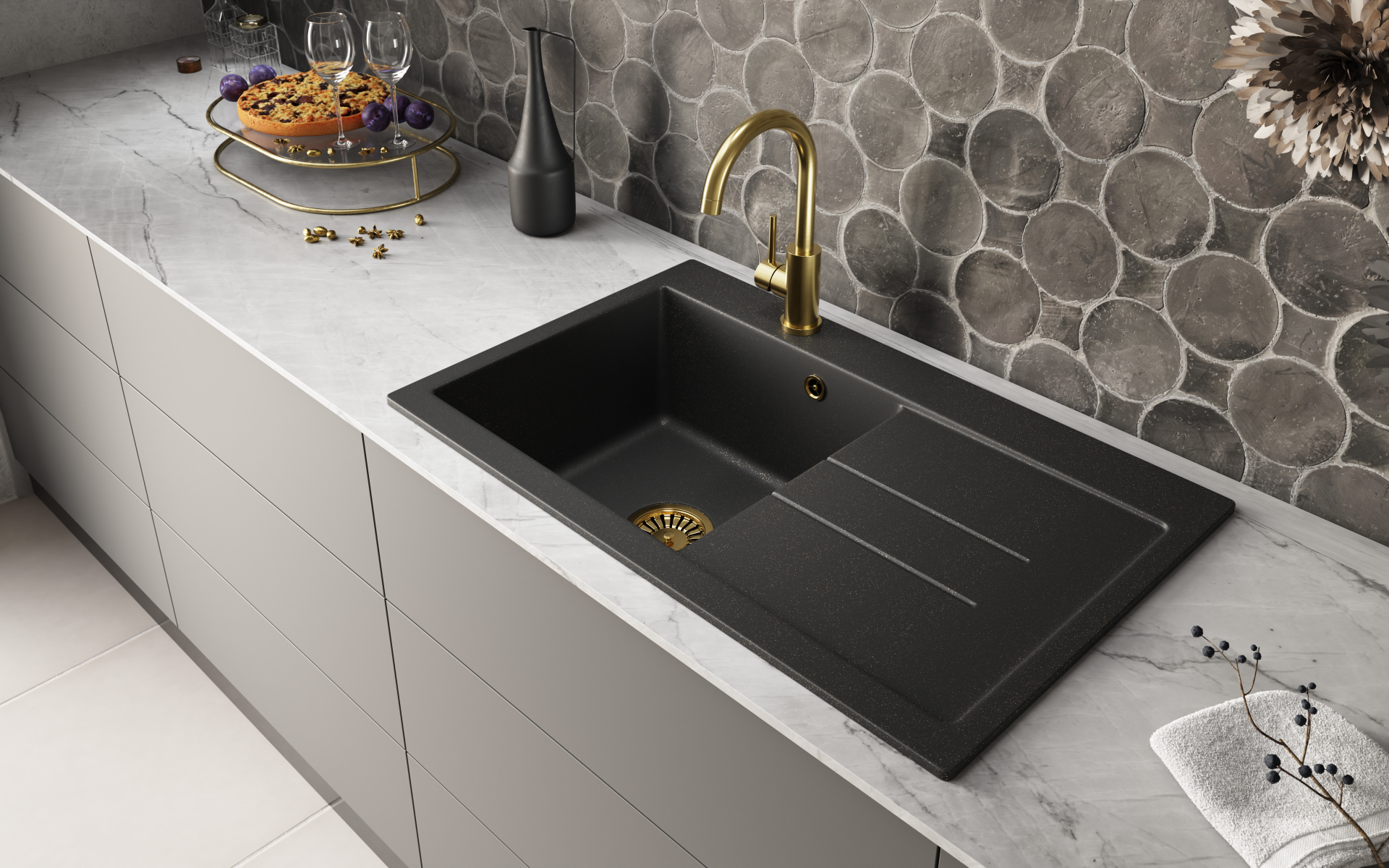 Bateria Noemi to elegancka, nowoczesna bateria w kolorze złotym pasującym do oferowanych przez nas zlewozmywaków.