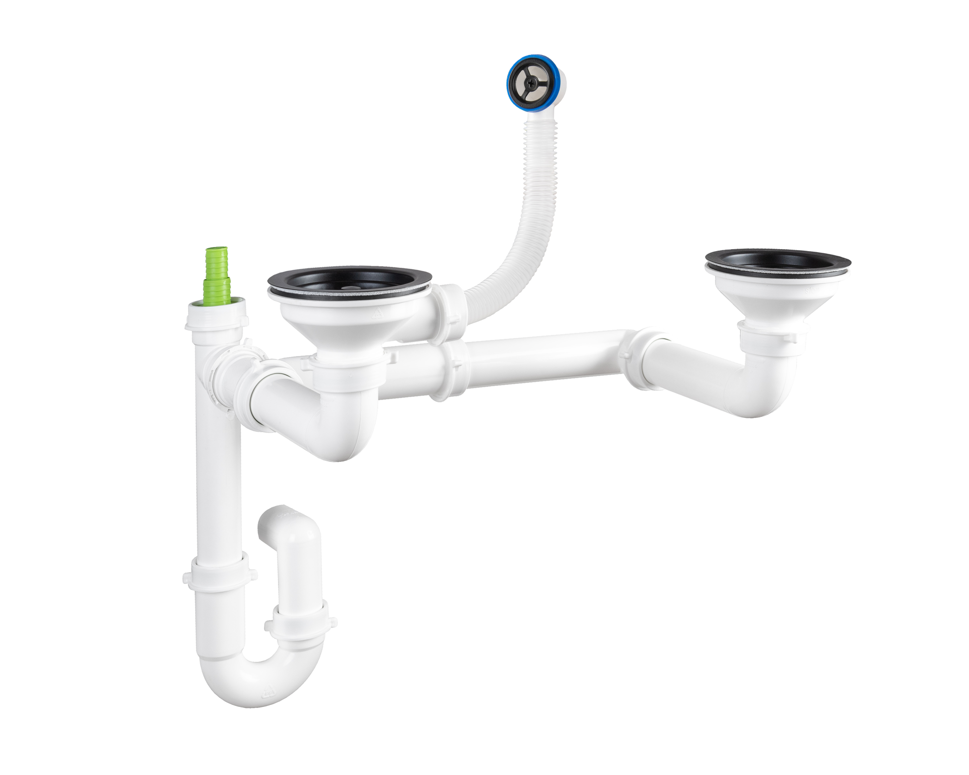 Typ: syfon przyścienny - nie wymaga tyle miejsca pod zlewem co tradycyjne syfony starego typu. Dzięki temu możliwe jest lepsze wykorzystanie przestrzeni w szafce pod zlewem.